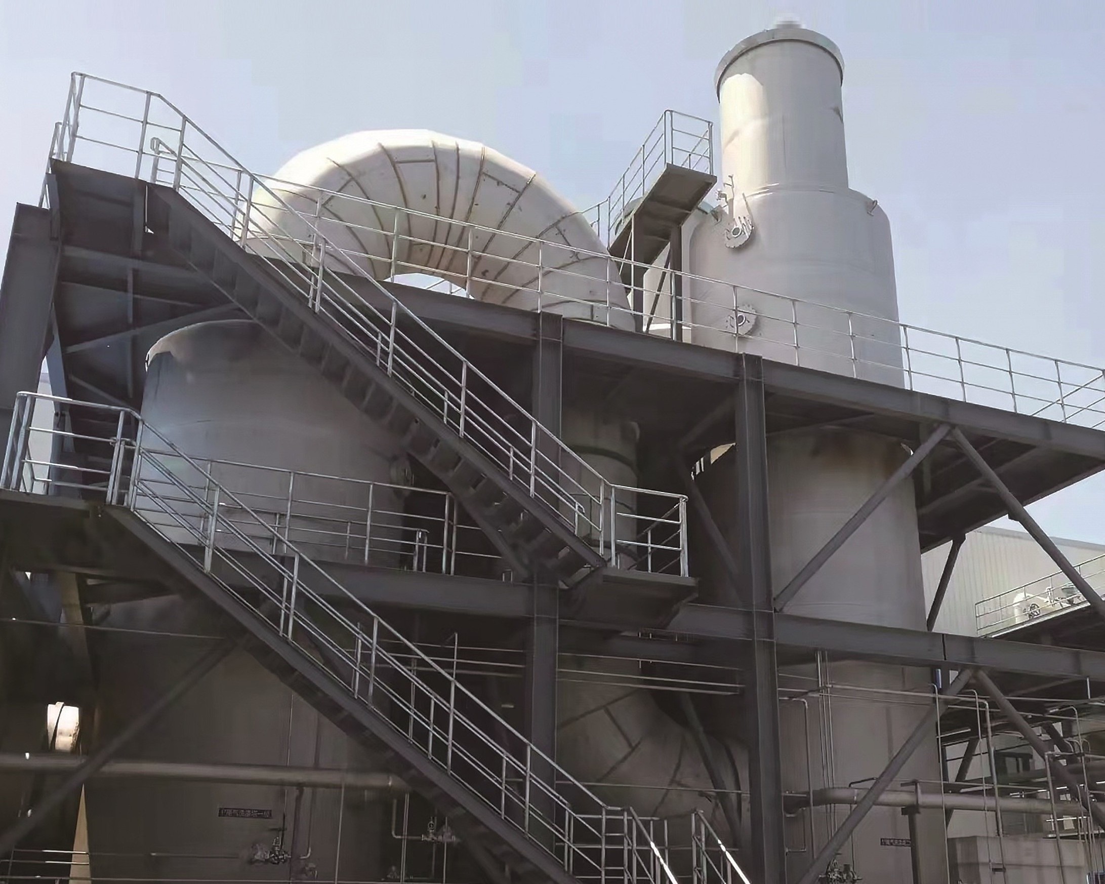 水劑通過(guò)泵送至干燥塔頂?shù)碾x心式霧化器(又稱為旋轉(zhuǎn)式霧化器)將料液霧化,在干燥塔內(nèi),與來(lái)自塔體頂部熱風(fēng)分布器均風(fēng)后的熱空氣充分接觸,旋轉(zhuǎn)、并流向下,快速干燥形成粉粒狀產(chǎn)品,大部分產(chǎn)品從塔體錐底排出,尾氣從塔體錐部的出風(fēng)管引出進(jìn)入塔體后部的旋風(fēng)分離器分離,尾氣中夾帶的絕大多數(shù)產(chǎn)品被分離下來(lái),最終尾氣通過(guò)引風(fēng)機(jī)后部的水膜濕式除塵器洗滌凈化后排空,塔體錐部和旋風(fēng)分離器收集的產(chǎn)品,經(jīng)過(guò)氣力輸送系統(tǒng)冷卻、提升、匯集到產(chǎn)品暫存?zhèn)}。
